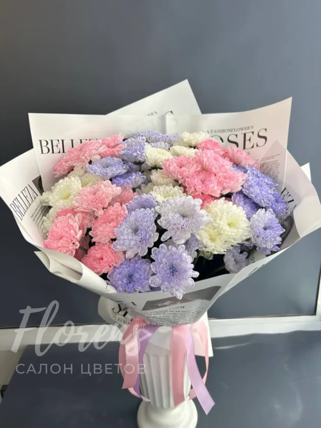 Букет из 11 белых пушистых хризантем сорта Алтай . Розовые , фиолетовые и белые хризантемы отлично смотрятся вместе